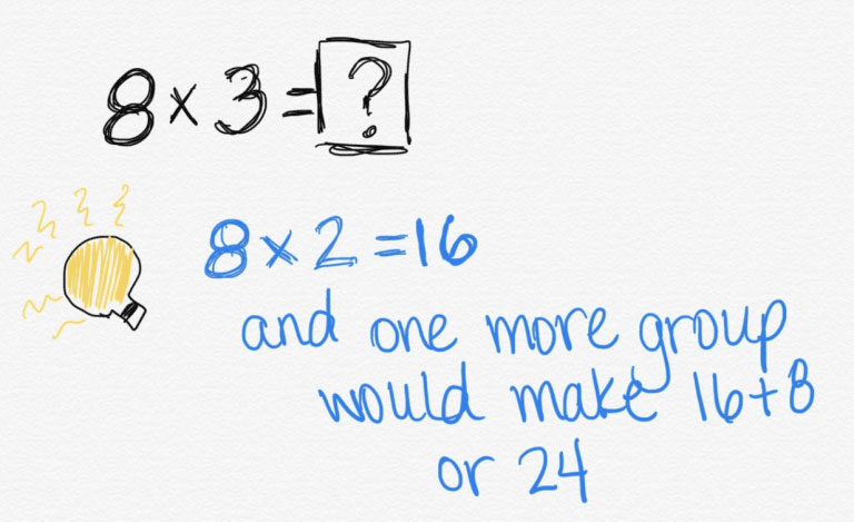 While you might remember flashcards and timed tests as a part of your experience in learning math facts, it is likely that you use derived facts more than you realize. Derived facts are when you use something that is partly known to help you figure out an unknown piece of information. For example, if you are trying to figure out 3 x 8, you might use derived facts to help you find the product is 24.