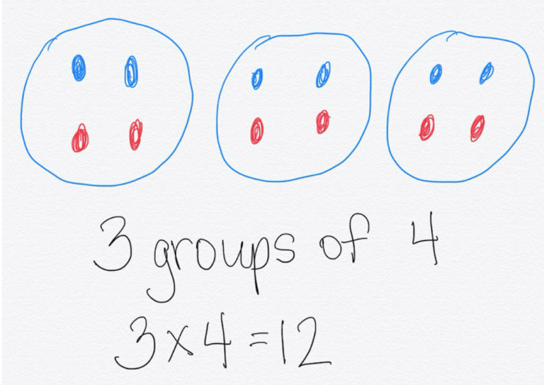 Many times, children apply what they know about addition and subtraction to help them begin to learn their basic facts for multiplication and division. In beginning to think about multiplication and division, children often consider “fairness”. This reasoning helps them develop the idea of equal groups and sharing. Often children begin by modeling or using objects (such as blocks) to explore this concept before moving to draw pictures. It is important to help children make the connection between these objects and pictures with the symbols we use to represent the equation. When they are able to visualize the quantities, children begin to notice patterns and a structure to mathematics. For example, 3 groups of 4 are the same as doubling 3 groups of 2: