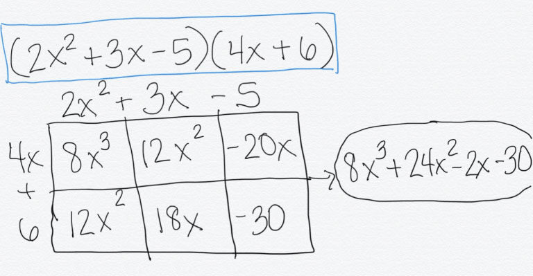 These strategies, such as partial products shown above, can be used in high school when multiplying polynomials. Here is an example of how the same strategy might be used to solve (2x^2 + 3x – 5)(4x + 6).