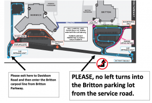 Carpool line is in the rear of the Norwich Building and the front of the Britton Building.